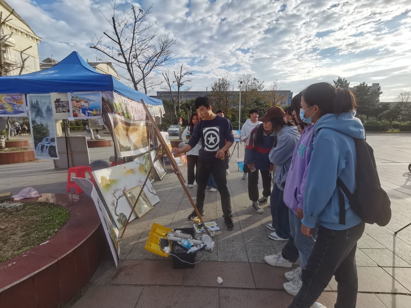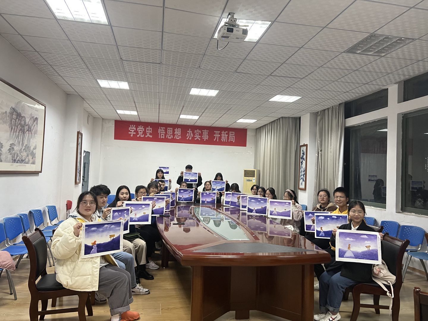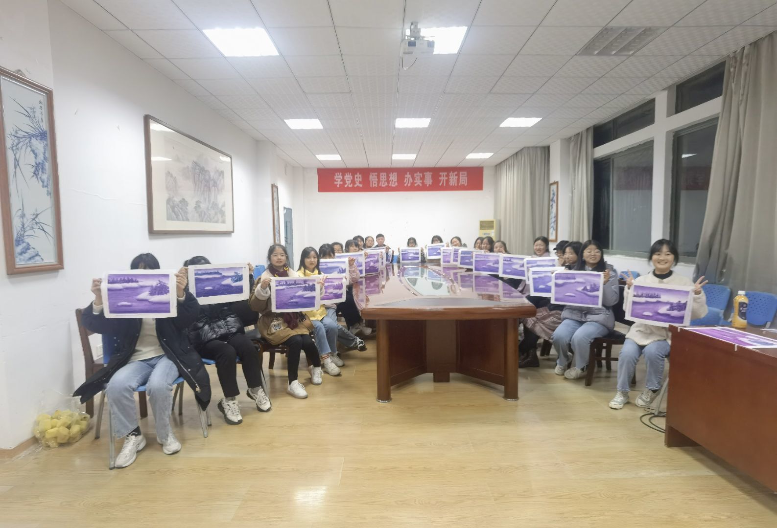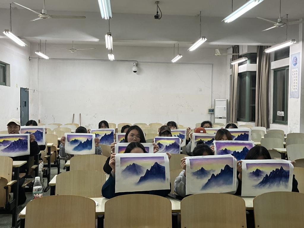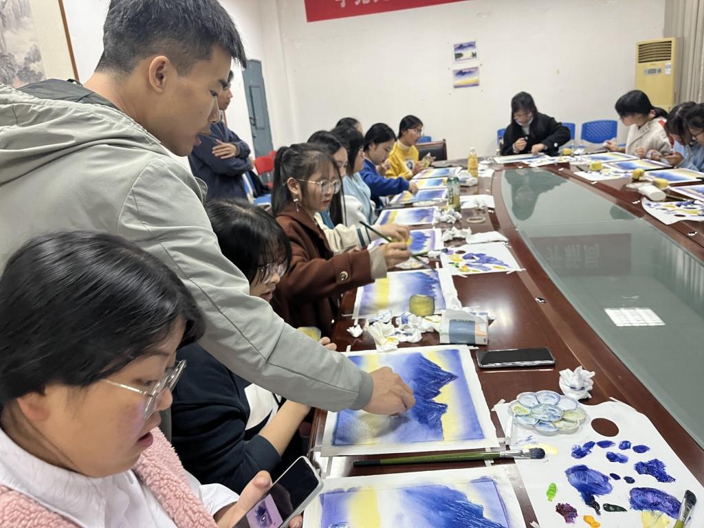 刀画社是公司精品社团之一,刀画是以钢刀代笔作画,采用油彩原料,先在油布式纸上涂抹,通过自制刀具在木板、布、纸上有规律地被刮减,达到画家的理想图形效,现已列入中国非物质文化遗产。 刀画协会专业指导教师谢龙晶现场指导员工作画,每位同学都做出了一幅幅精美的刀画作品。刀画社在2021年秋季学期在润园食堂门口摆放刀画展,吸引了全校师生驻足欣赏。