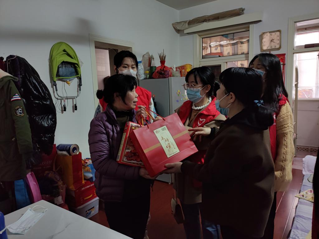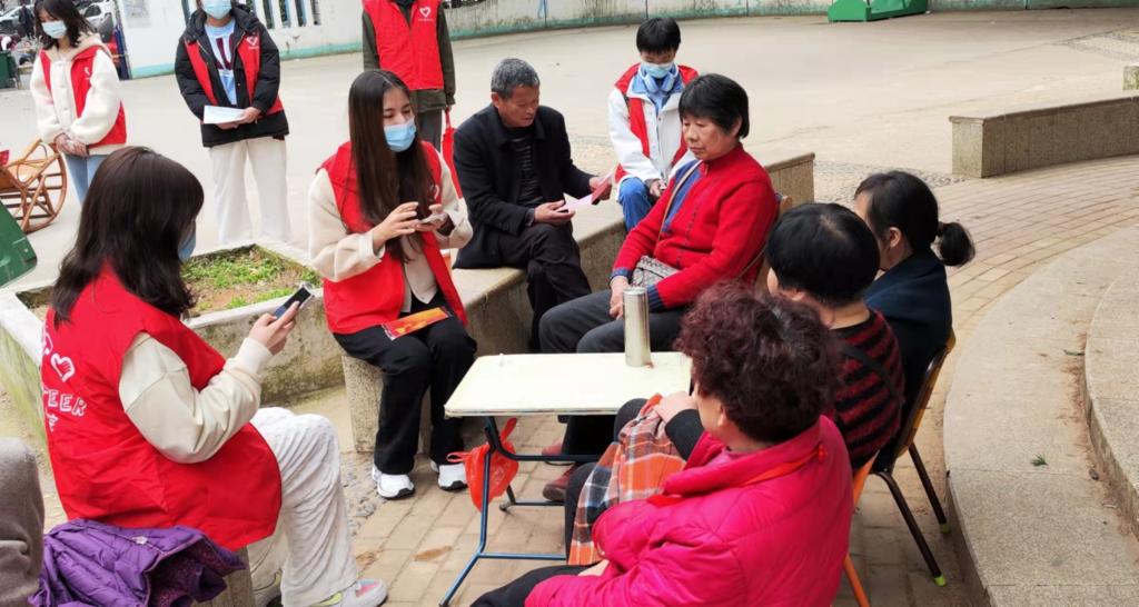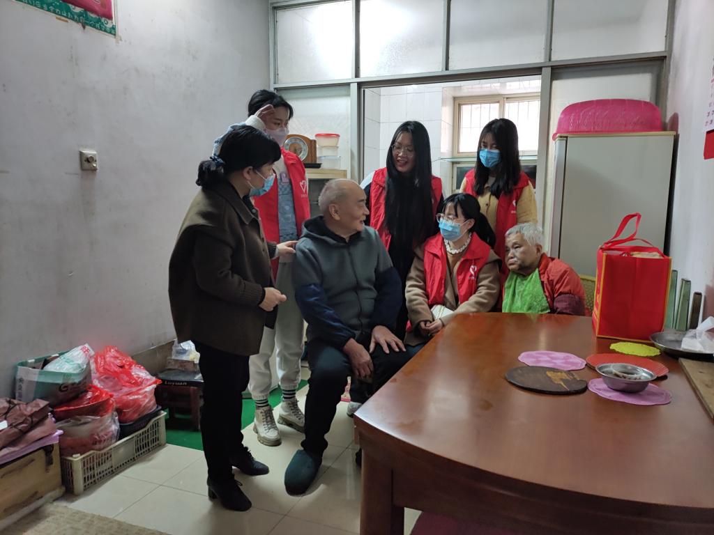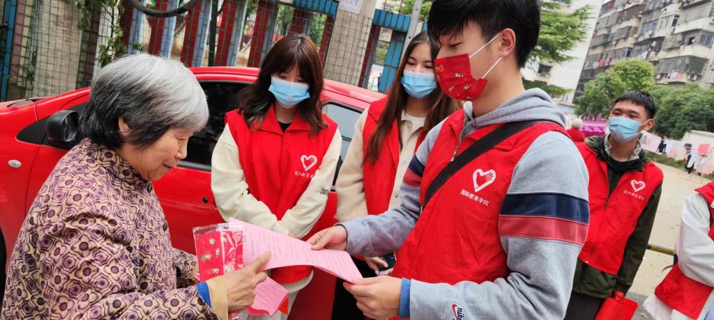 志愿者们首站来到江大南路社区党群服务中心,与社区工作人员做了简短的工作交流后,志愿者们分组行动。一部分志愿者来到社区开展防范电信网络诈骗宣传活动,发放宣传材料200余份,为社区居民现场解答疑惑,获得了社区居民的赞许和欢迎。另一部分志愿者进行疫情防控知识宣传,有效的增强社区居民的疫情安全防范意识。其余志愿者在社区人员的带领下来到社区困难老人家中看望,赠送慰问品,为老人们送上些许温暖。