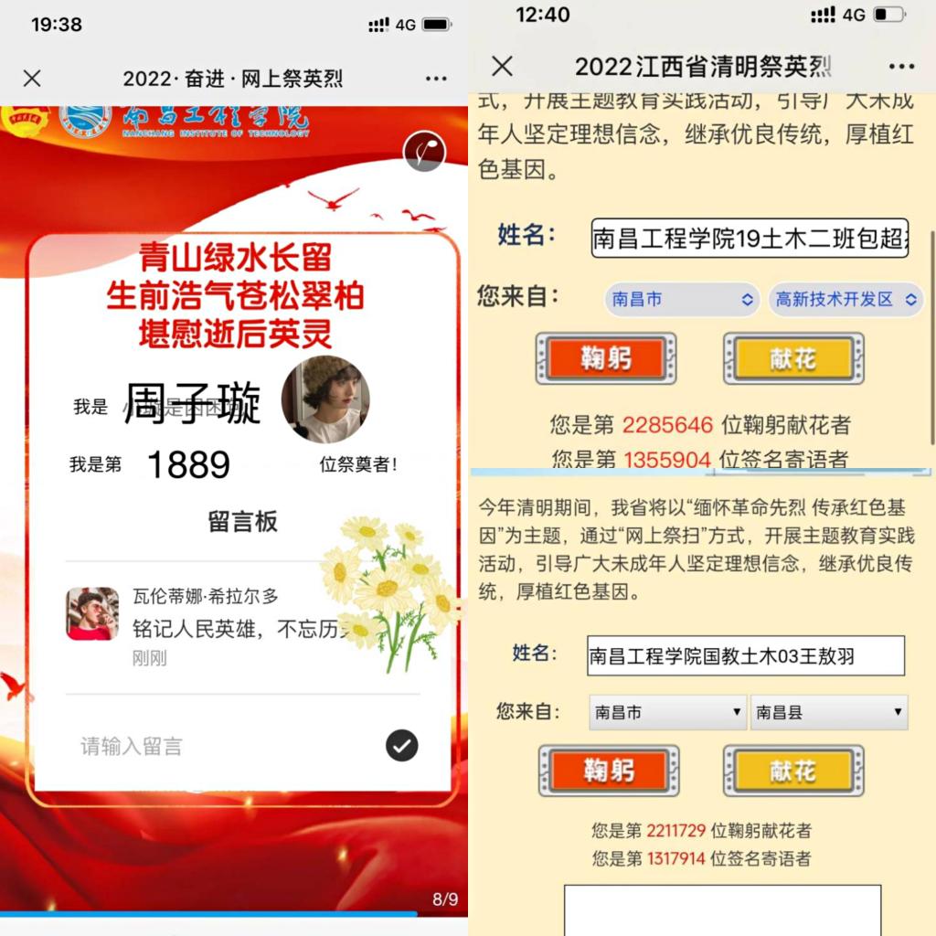 各团支书和团员青年怀着沉重的心情向革命先烈及东航罹难同胞默哀,并重温了有关八一起义的历史事件。通过“中华英烈网”和文明江西公众号线上祭英烈平台向英烈们“鞠躬、献花、敬酒、上香”,向革命先辈和烈士们表达敬意、寄托哀思,寄语先烈,缅怀历史,表达心中真挚情感。最后,团支书向团员青年讲述了多件革命先烈的英雄事迹,学习和体会了烈士真挚的爱国情怀和无私的奉献精神,增强了团员青年对英烈的崇敬之情以及对国家民族的热爱。