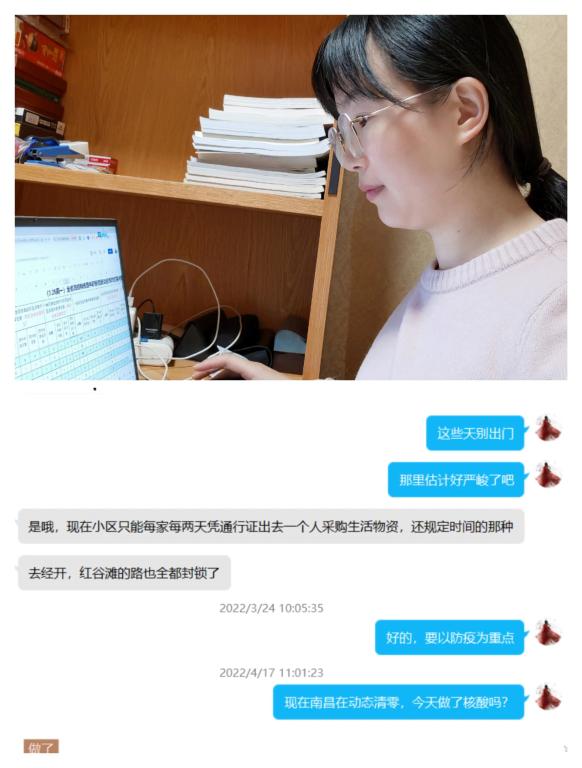 疫情暴发一月有余,辅导员老师赖卓、闫方超与员工同吃同住在校园里,用一线的执着坚守、贴心的指导问候,带给员工信心、暖心、定心。他们每天坚持深入员工寝室,全面摸排员工情况,坚持“日报告,零报告”制度,确保员工宿舍的稳定生活;公司组织全员核酸检测10余次来,无论是早上五点半还是凌晨十二点半,从组织整队到检测完毕在核酸检测现场永远都能看到他们坚守的身影;员工志愿者日夜值勤在值班点,他们每天也常去看望大家,送去诚挚的慰问和关心。公司管控又临近毕业季,对出现迷茫、焦虑、烦躁情绪的员工,他们结合职责在办公室、会议室一一约谈,或为他们提供就业指导和工作推荐,或及时疏导员工的心理问题。身为党员,他们还加入了教师志愿服务队,全身心的守候师生的校园安全。辅导员杜嫣艳负责公司疫情防控数据表格的统计上报,督促全院员工每天百分百完成支付宝打卡,与前线学工人保持实时联控,一对一联系公司24名在昌校外员工,准确了解员工校外核酸检测情况和实地动态,建立了实时更新的员工数据台账,做到不遗漏一个员工,确保每个数据准确无误,以网络为战疫阵地,通过键盘传输温暖关怀和殷殷叮嘱,以另一种方式守护员工,安定员工燥郁焦虑的心。