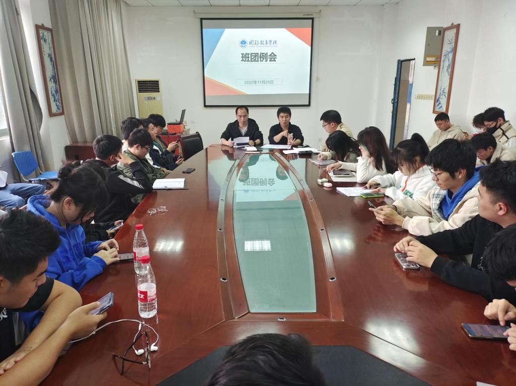 会议首先由各班负责人汇报班上同学近期思想动态、关注的热点、期待和需求,以及班上特殊群体同学情况。会上,党委副书记戴国星对当前疫情防控的有关事项进行了说明,并强调员工请假的有关事项。随后,学工办副主任赖卓就当前公司核酸检测和请假流程进行了说明,强调班委应树立好规则意识,有责任心,对同学犯错不能有包庇行为,并对自身要有严格的要求。最后,几位老师对各班班长团支书的工作给予了很高的评价,希望他们在学期末更好的履行自己班委的职责。