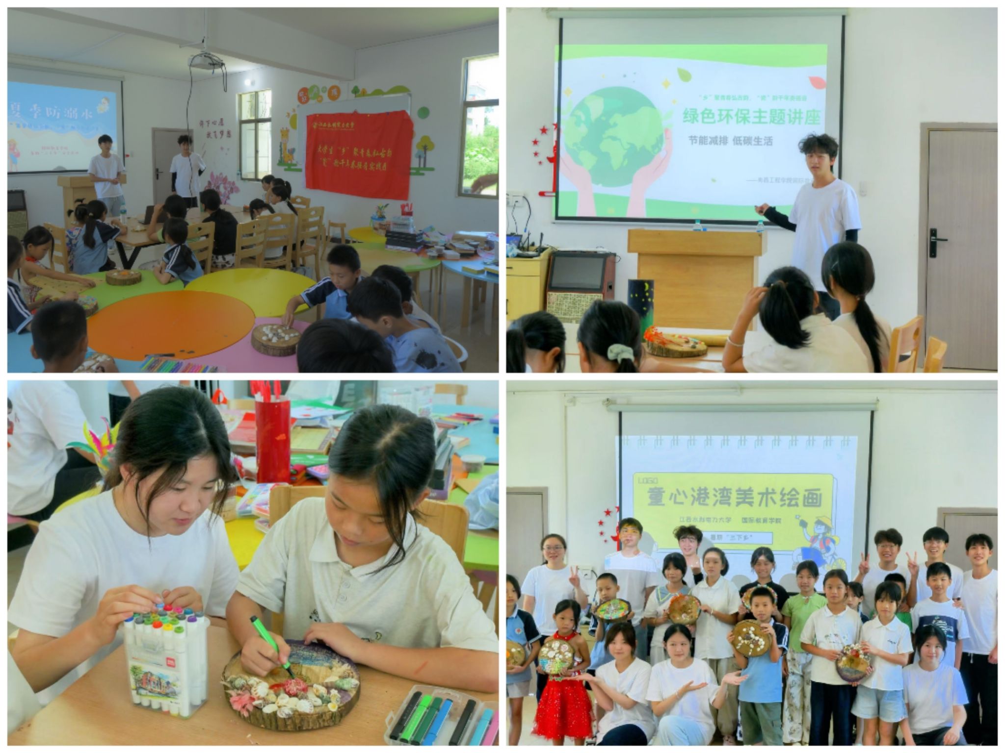 在环保艺术课堂中,实践团成员指导孩子们使用环保颜料进行树木彩绘,并融入荧光材料装饰,通过讲解荧光成分的环保特性,引导孩子们思考材料与自然的关系。夜幕下荧光作品熠熠生辉,孩子们在“点亮仪式”中共同许下保护地球的美好承诺。在安全教育环节,成员们则采用“理论+实践”模式,系统开展防溺水教育,教授自救互救技能,组织“六不准”口诀演练。通过互动问答、角色扮演等生动形式,让安全知识在轻松愉快的氛围中深入人心。