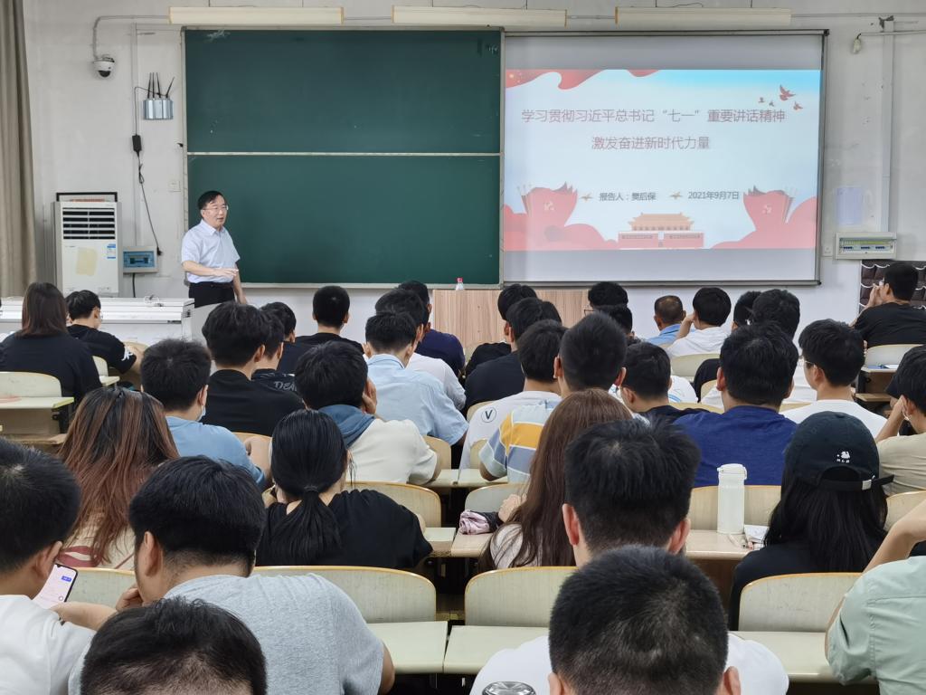 根据公司学习贯彻习近平总书记在庆祝中国共产党成立100周年大会上重要讲话精神宣讲工作方案要求,9月7日下午,副董事长樊后保在教学北楼B区213给联系班级宣讲习近平总书记“七一”重要讲话精神,宣讲由公司党委书记陈春柏主持,公司党员教师、联系班级2018级电气工程及其自动化1、2班共计100余人聆听了宣讲。