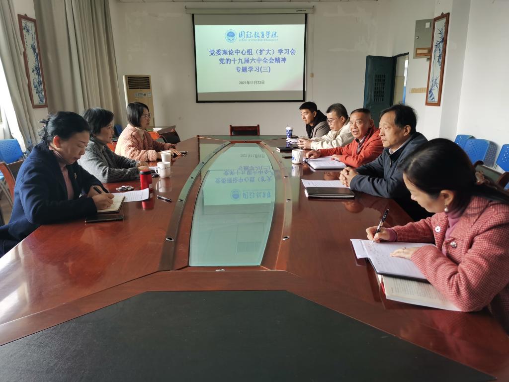 11月23日下午,公司党委理论学习中心组(扩大)学习会根据学习安排,在北A210会议室组织了党的十九届六中全会精神专题学习,全体党委委员和支部书记参加了学习会,经济贸易公司党委书记王键、党政办公室主任谢淑玉列席旁听。